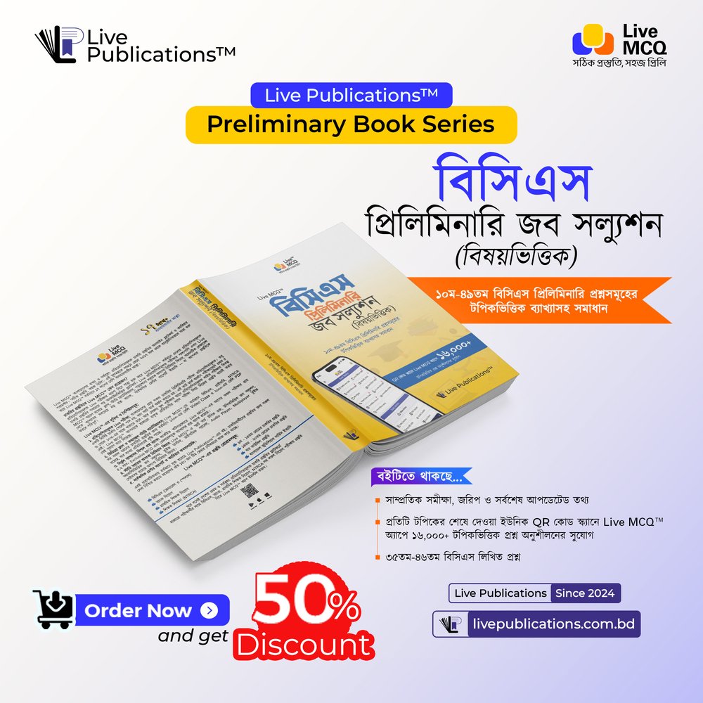 এই বাস্তব চাহিদাকে সামনে রেখে এবং আপনাদের ৫০তম বিসিএস প্রস্তুতিকে (50th bcs preliminary preparation) সহজ করতে Live Publications প্রকাশ করেছে নতুন — Live MCQ™ “বিসিএস প্রিলিমিনারি Job Solution (বিষয়ভিত্তিক) বই”। বইটি মূলত একটি BCS preliminary guide book, যেখানে একসাথে পাওয়া যাবে ১০ম–৪৯তম বিসিএস প্রশ্ন, বিশ্লেষণ, ব্যাখ্যা এবং ডিজিটাল প্র্যাকটিসের সুযোগ।